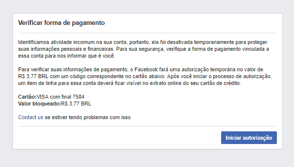 Muitas pessoas, assim como nós, pensaram que se tratava de mais uma atualização por parte do Facebook, ou mesmo alguma espécie de bug na plataforma. Mas pasmem, não foi nada disso que aconteceu! O que realmente ocorreu, foi que o Facebook resolveu, sem aviso, verificar se os cartões usados nas contas de anúncios, realmente pertenciam aos proprietários. Este procedimento já existia, mas não era disparado em grande escala.