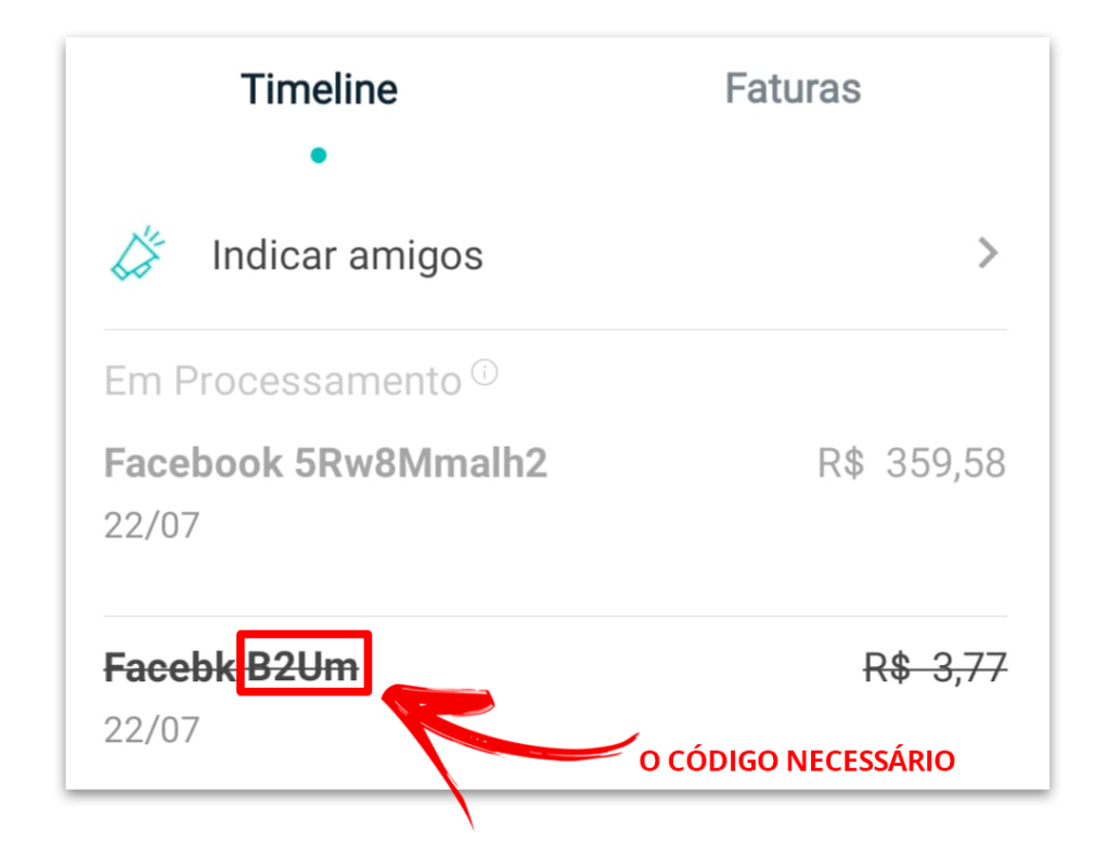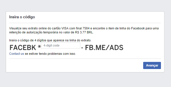 Veja que na imagem a baixo de uma fatura, a transação normal de pagamento de anúncios tem o código bem maior (é a que tem o valor cobrado mais caro, a de R$359,58), já a transação que vem o código de confirmação do Facebeook é de apenas 4 dígitos (e num valor bem menor, geralmente de R$3,77) e quando confirmado o valor logo é estornado.